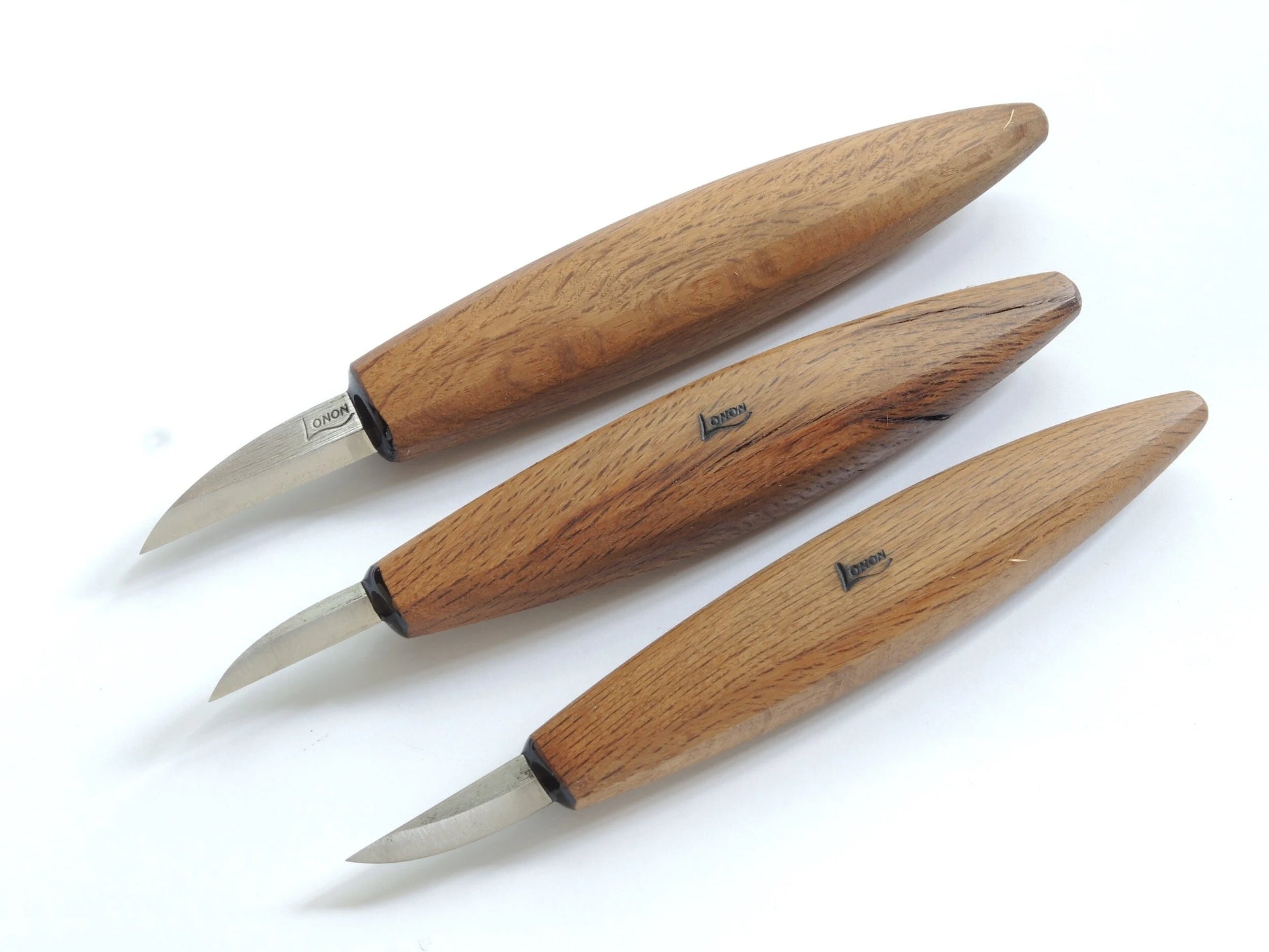 Here is a handy set of three knives well suited for detail work. The largest has a straight wharncliffe style blade that is approximately 1 3/4” long. Next is a straight blade chip carving knife and third is curved blade detail knife. Both of the smaller knives have blades that are approximately 1 1/8” -1 1/4” long. We are offering a limited number of these sets with matched handles of various special hardwood.