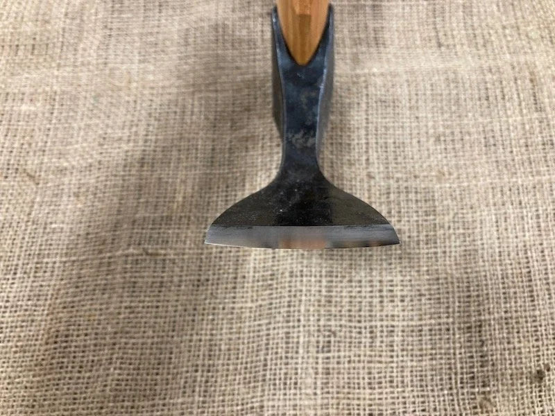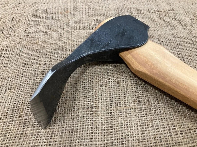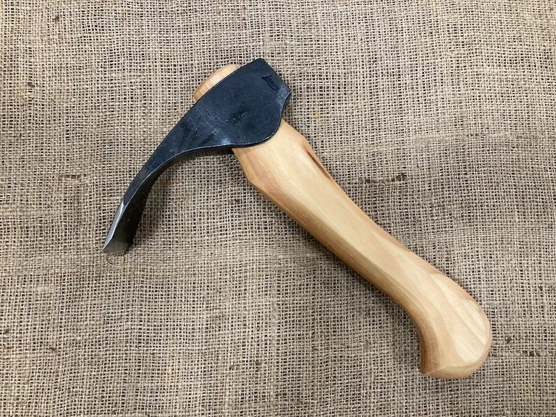 This small flat adze is forged from solid 4150 alloy steel. It has a hand crafted hickory handle, finished with a penetrating oil/varnish mix. Handles are 9"-10" long. The flat blade has a slight curve for ease of use and sharpening. This adze is preferred by some carvers for working the outside of bowls. Blades are approximately 1 3/4" - 2" across. Overall weight varies between 24 - 27 oz.