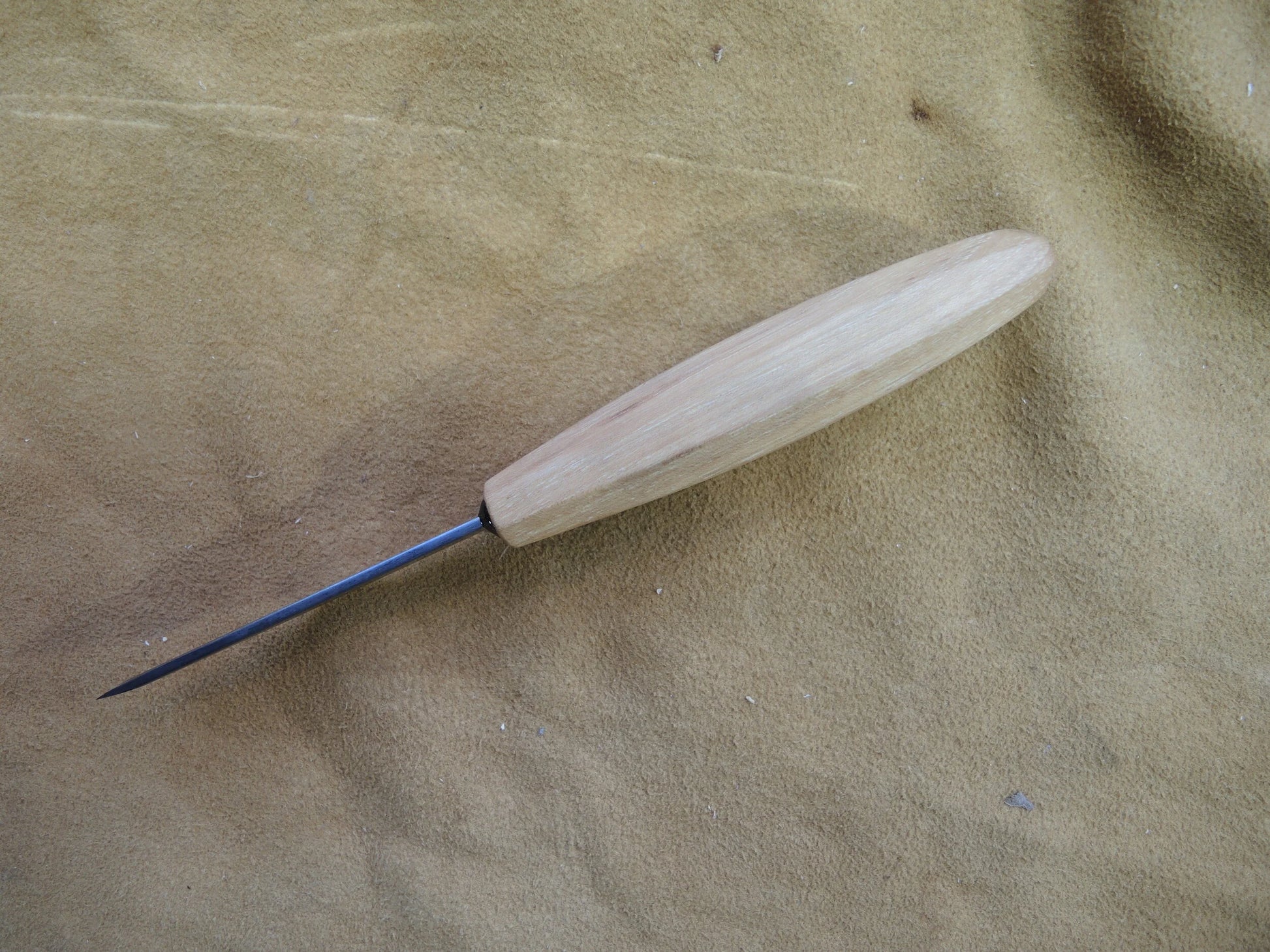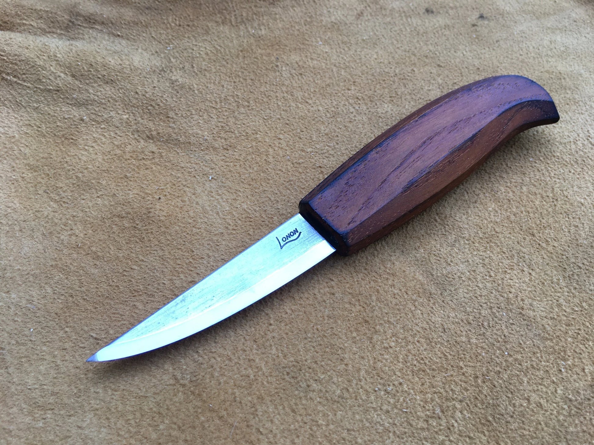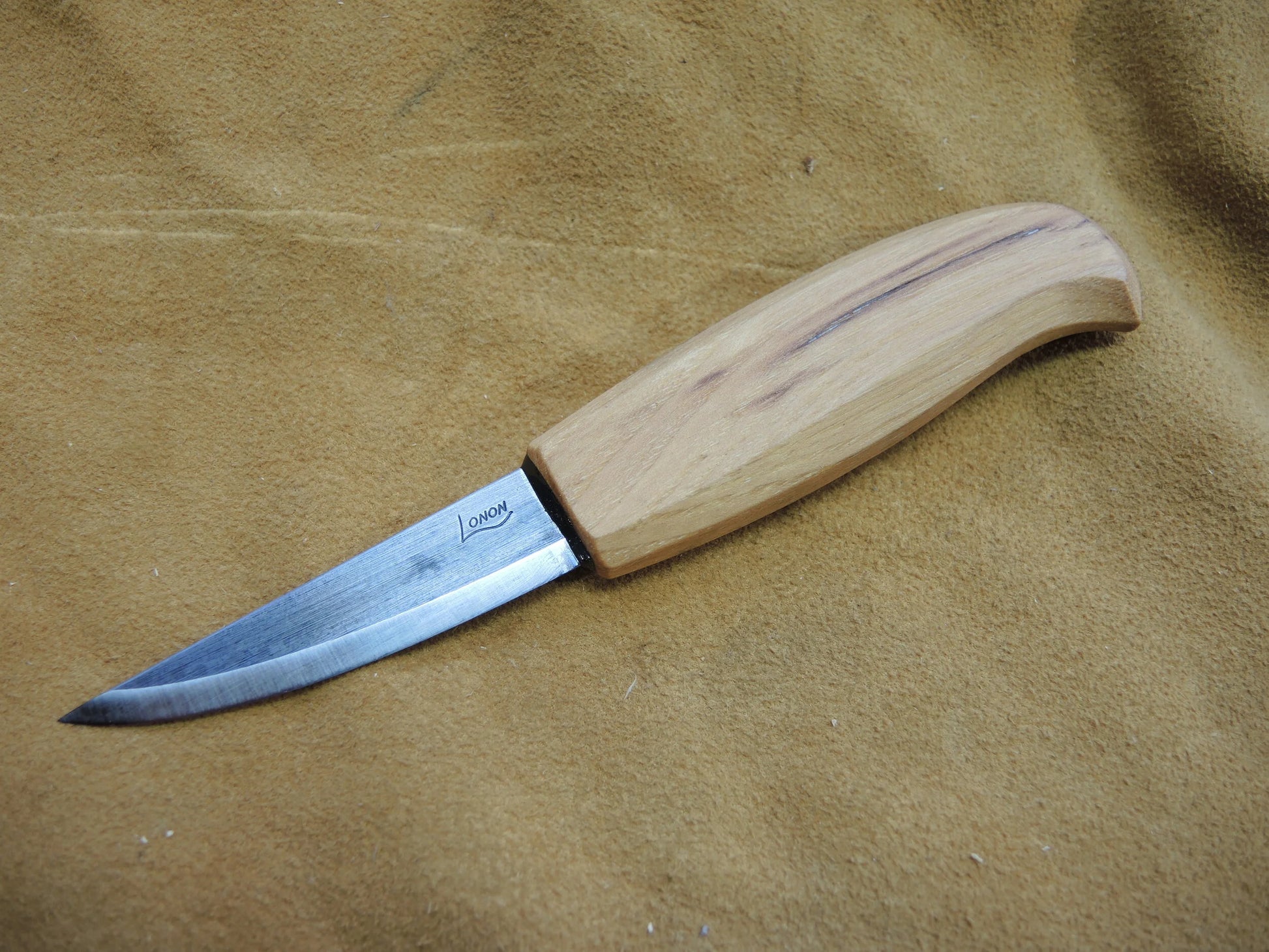 This sloyd knife sports a blade just shy of 3 1/4" long of O-1 tool steel, with a 25 degree flat grind. The blade is slightly wider at the base than my Short Sloyd knife, and the tip is just narrow enough to have great action without being a needle point. The octagonal handle is hand made from a variety of beautiful hardwoods.