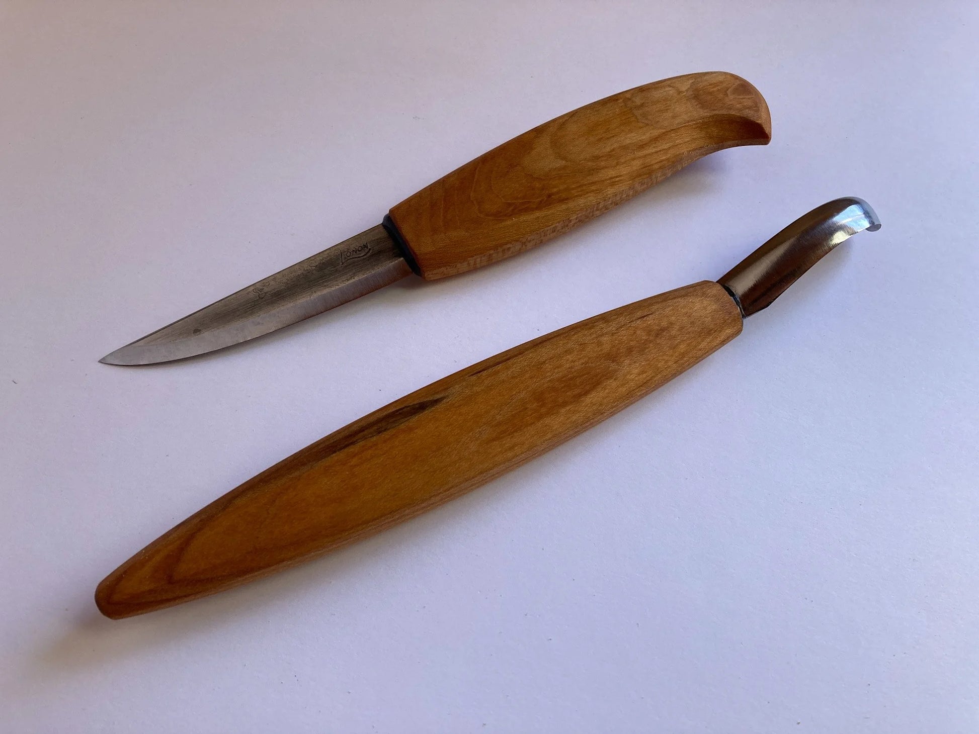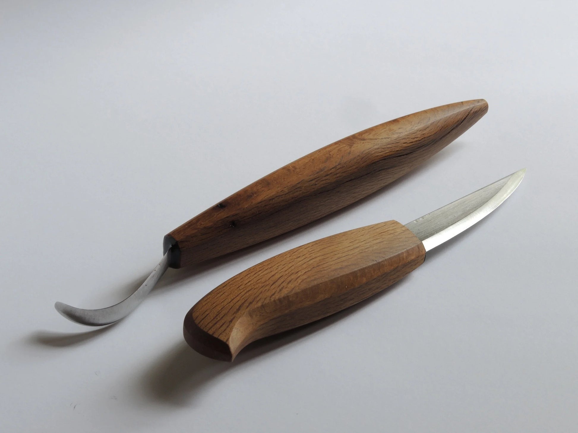 This spoon carving set includes our long handled, right-hand spoon knife and 3” sloyd knife, with matched handles of extra special woods.