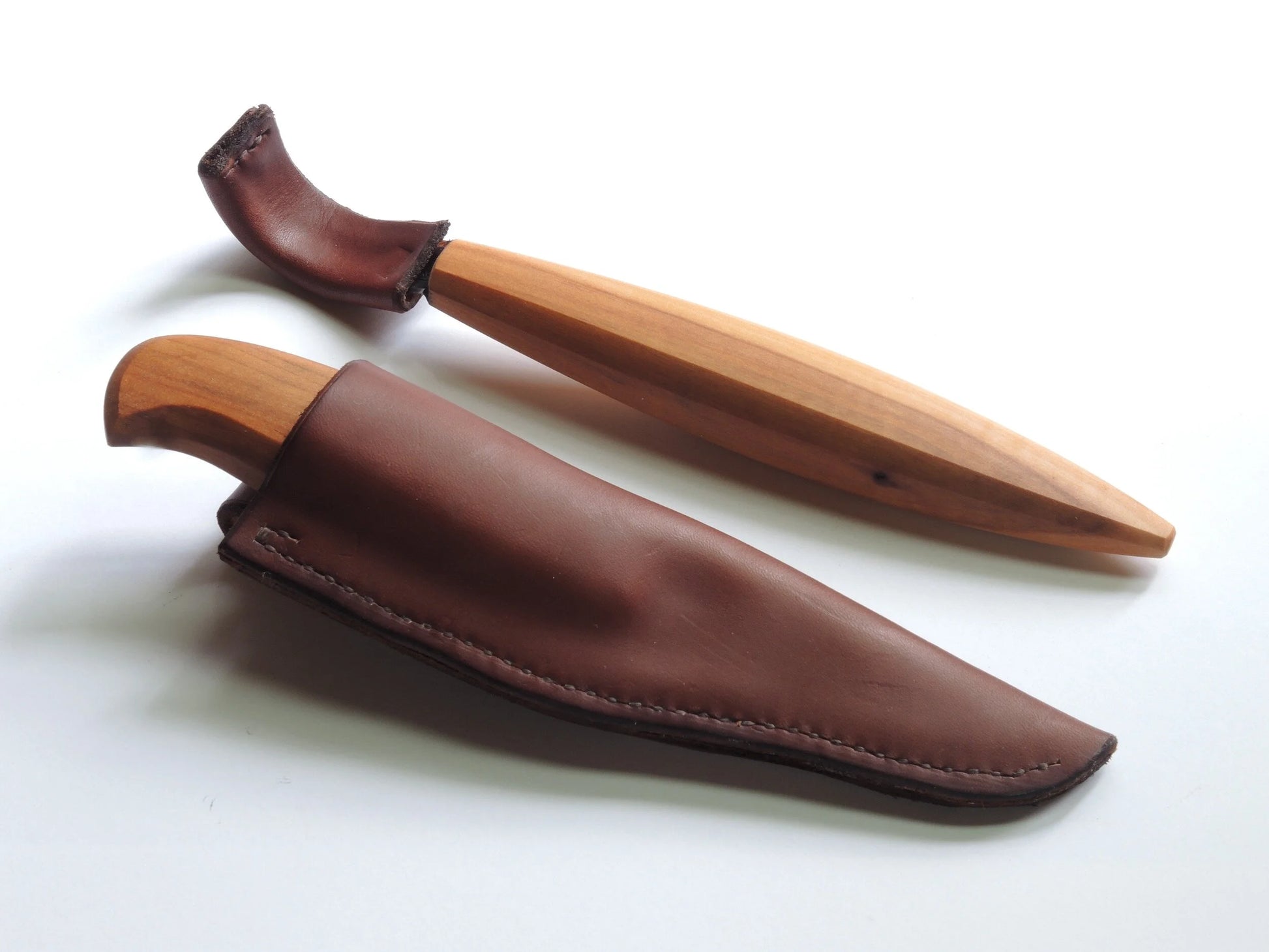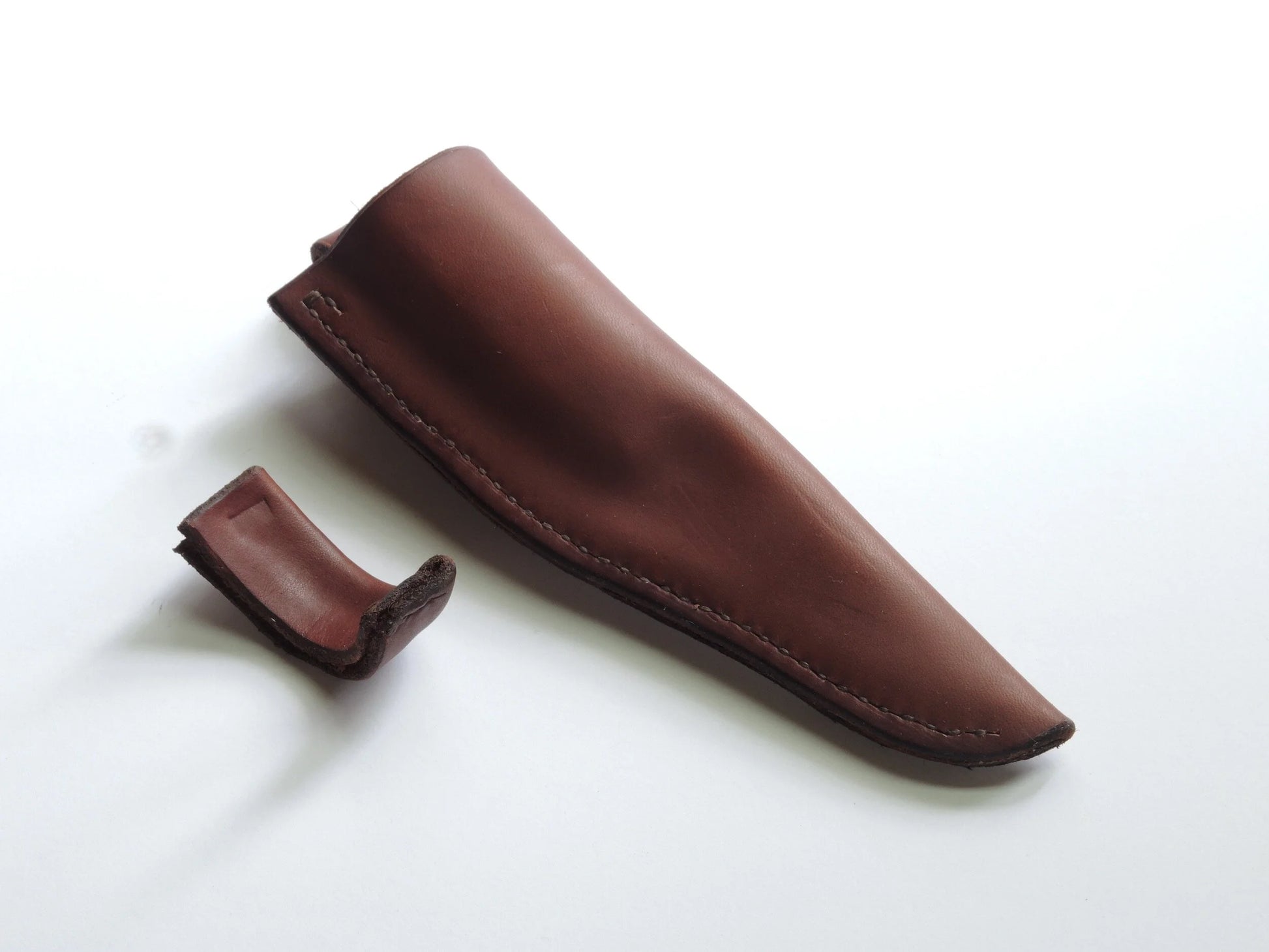 The spoon knife comes with a simple leather blade cover. This batch does not come with the Sloyd knife sheath. If they are in stock you may purchase them separately.