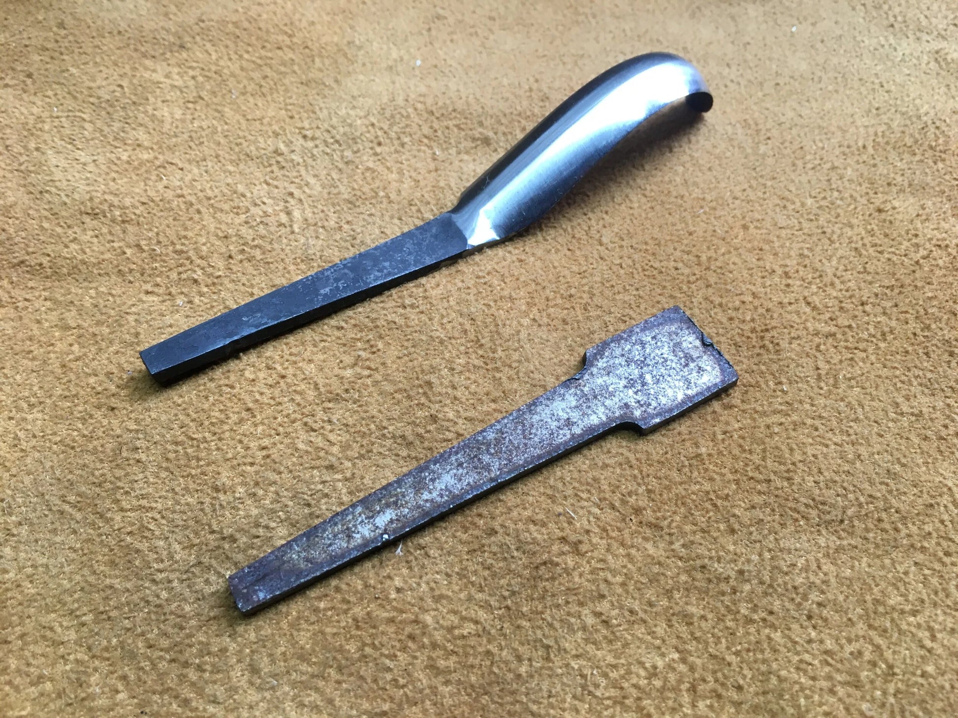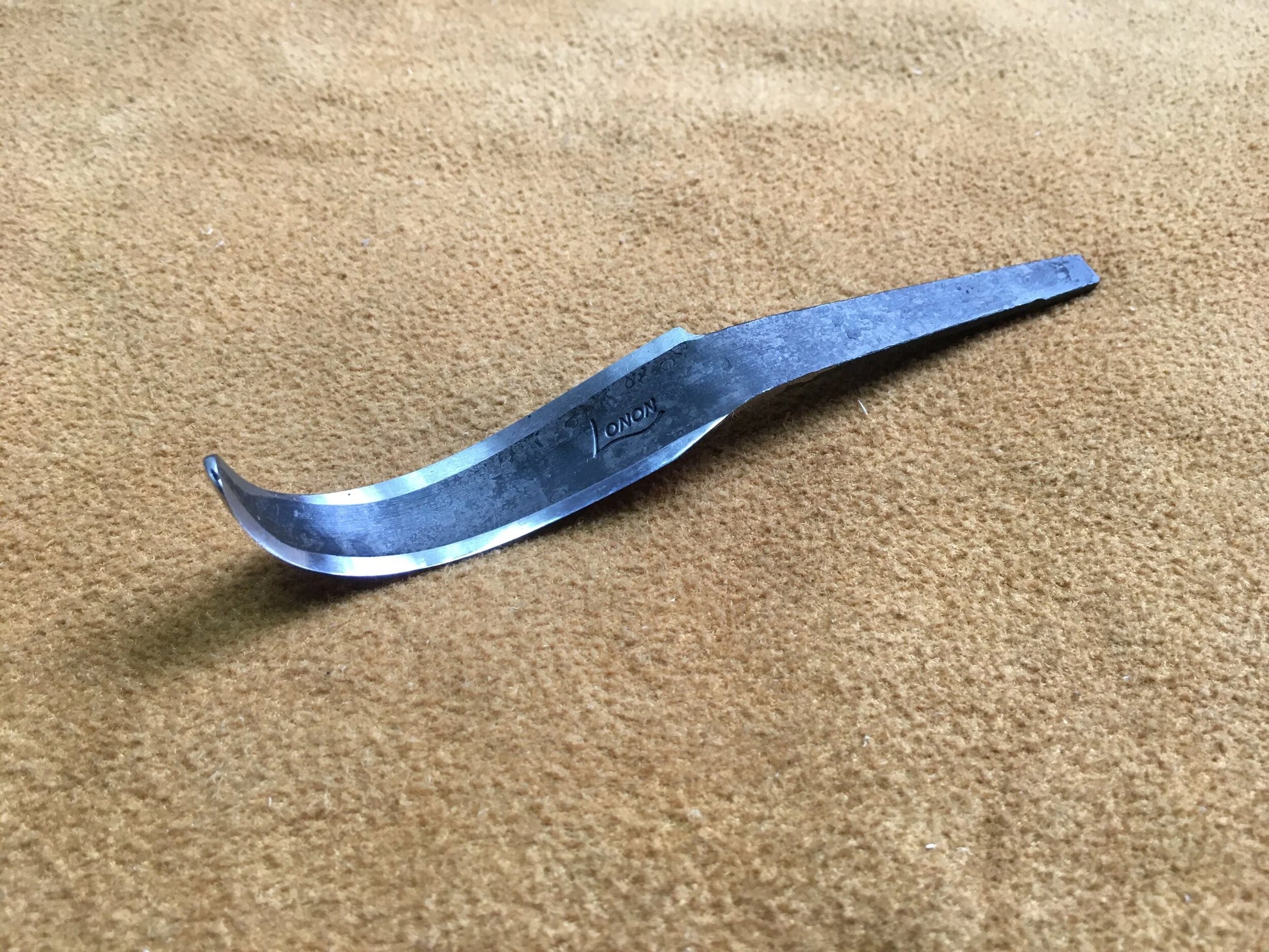 The result of years of experience in wood carving and toolmaking, this spoon knife is just the tool for carving the hollow part of wooden spoons. The blade is plasma cut from O-1 tool steel, forged into a hollow, bent into a variable sweep curve, hardened, tempered, ground, and sharpened.