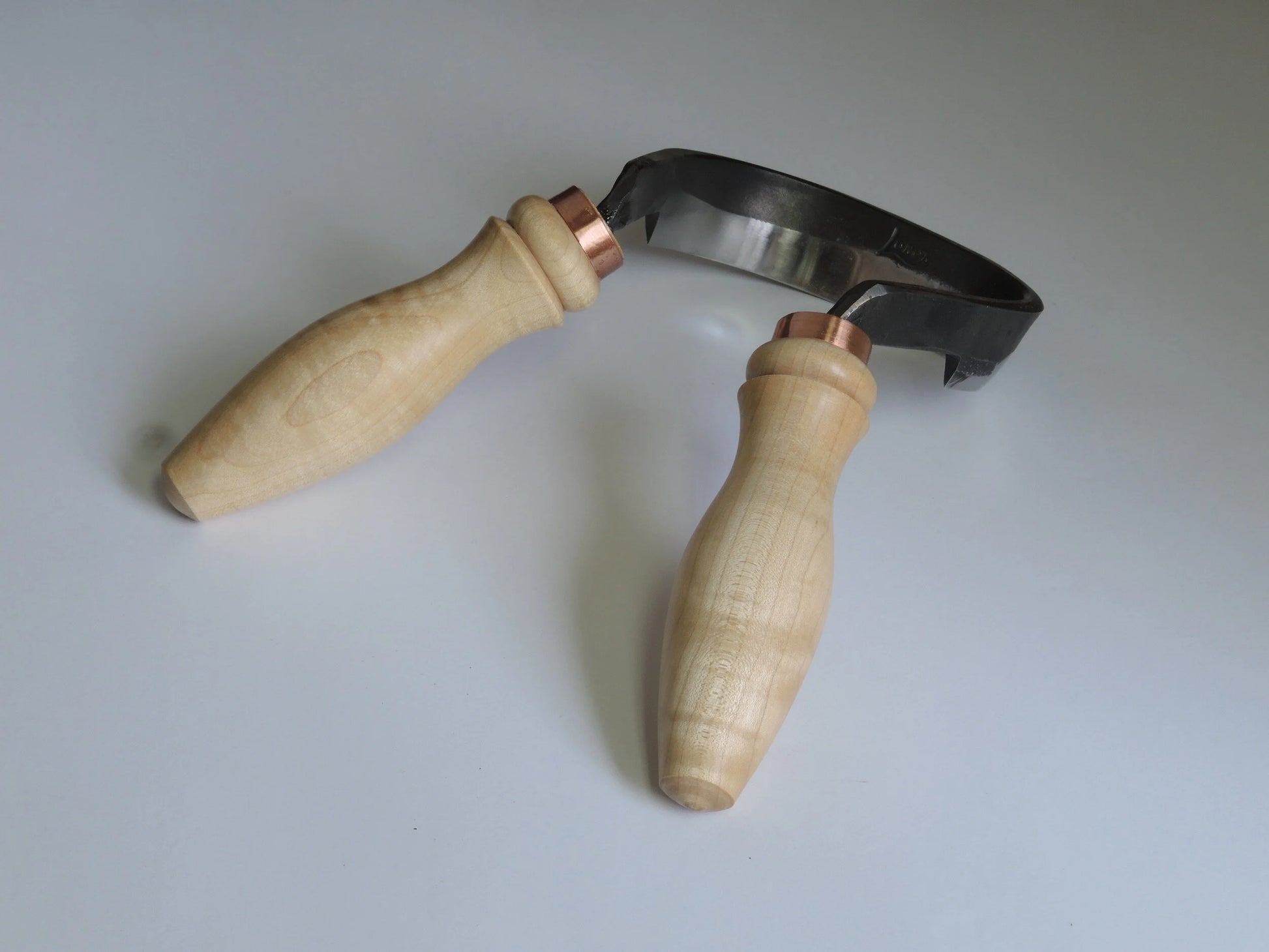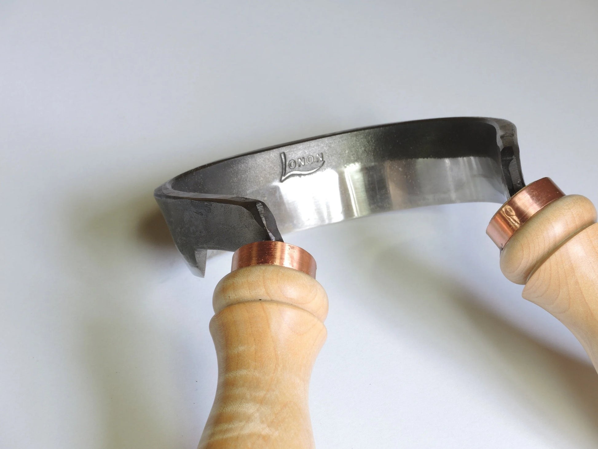 The chair maker's inshave is forged from 5160 spring steel, and is designed to carve the saddle of Windsor, and other stick chair seats. The blade is elliptical, with a very shallow sweep in the center section. This gives a smoother finish than a round sweep, minimizing the work of the travisher. The hardwood handles are turned and have copper ferrules. This inshave is the result of years of making, using, testing and consulting with professional chair makers. Based on an antique original in my collection, I believe this to be the most ergonomic inshave available today.